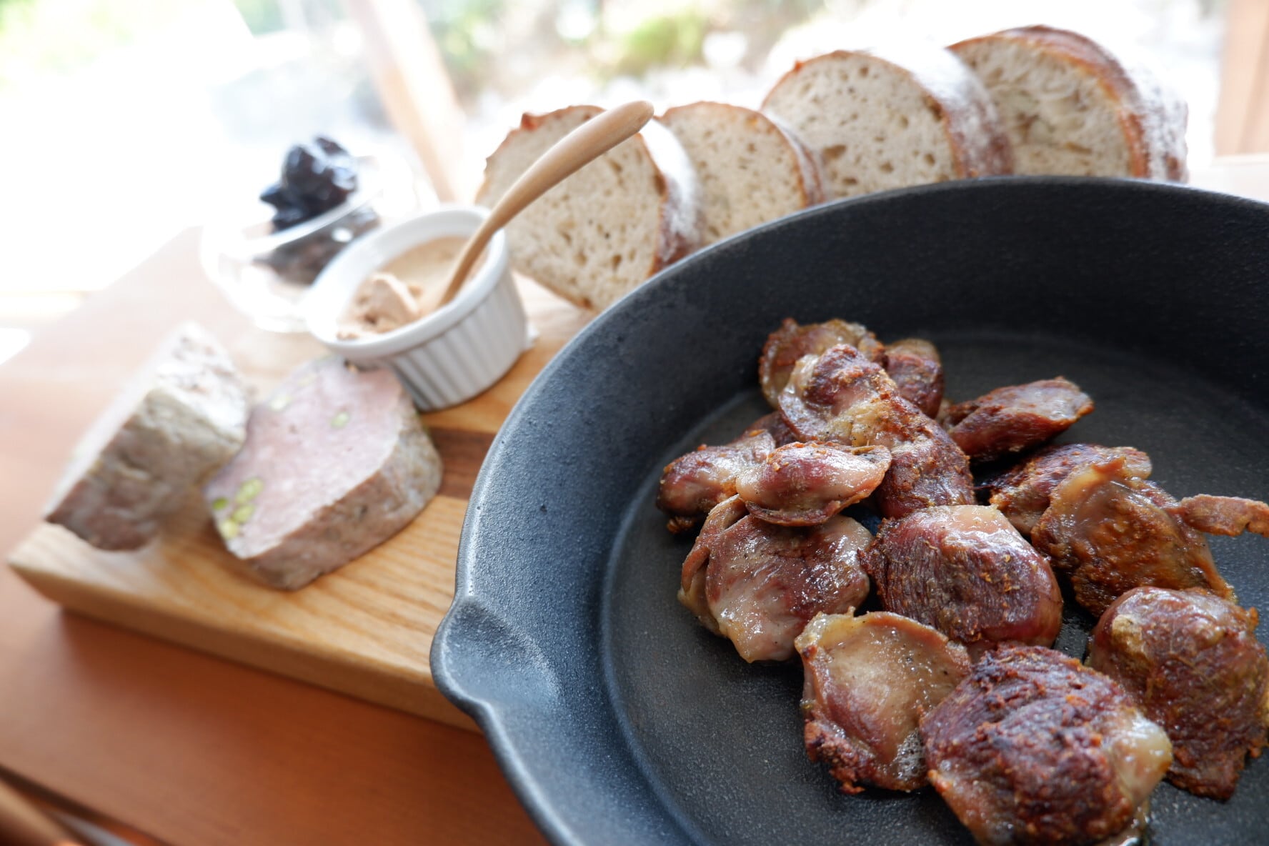 • 秋川牧園さんの砂肝のコンフィ: 低温のオイルでじっくり煮込んだ、食感が楽しい一品。