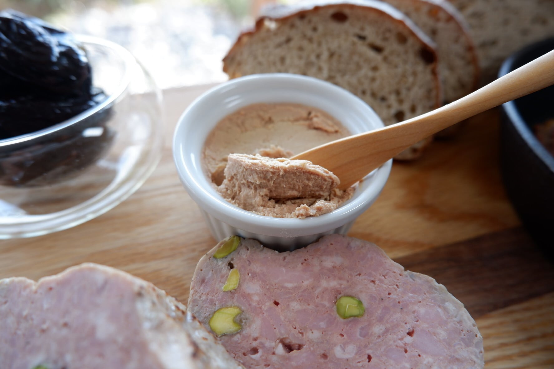 • むつみ豚とピスタチオのパテ・ド・カンパーニュ: 豚肉の旨味が凝縮された、定番の田舎風パテ。