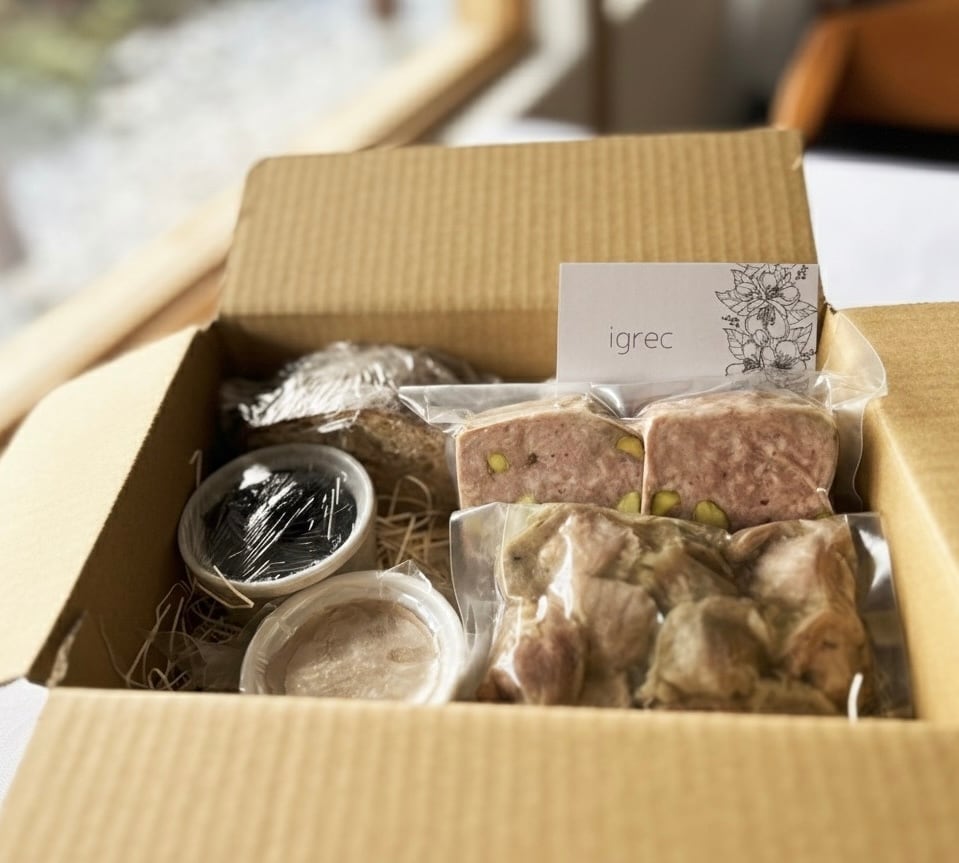 )鴨ロースト(鴨肉・塩・胡椒)パテ・ド・カンパーニュ(豚肉・鶏レバー・玉子・生クリーム・玉ねぎ・ピスタチオ・洋酒・香辛料・塩胡椒)/ コンフィ(砂肝・オリーブオイル・ヒマワリ油・塩胡椒)/ 白レバームース(鶏レバー・バター・生クリーム・洋酒・塩胡椒)/ プルーン(ドライプルーン・赤ワイン・砂糖・香辛料)/ パン(小麦粉・酒粕・ゴマ・ヒマワリの種・米油・砂糖・塩・ドライイースト)
