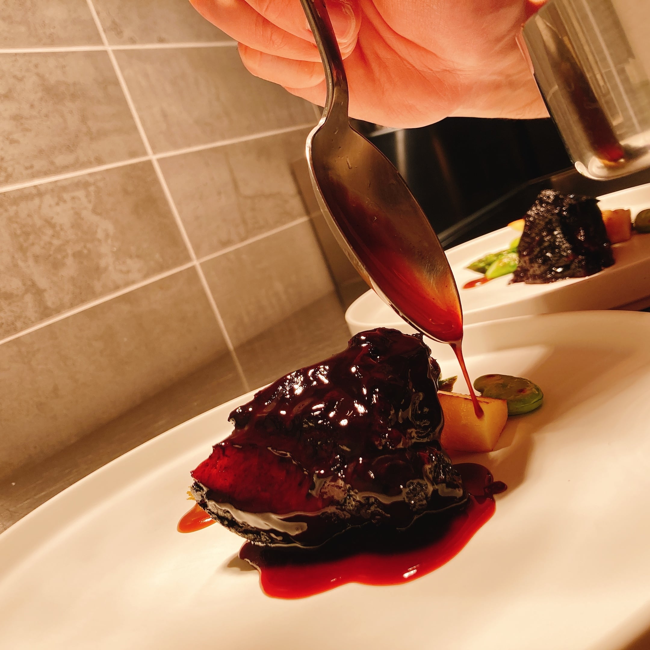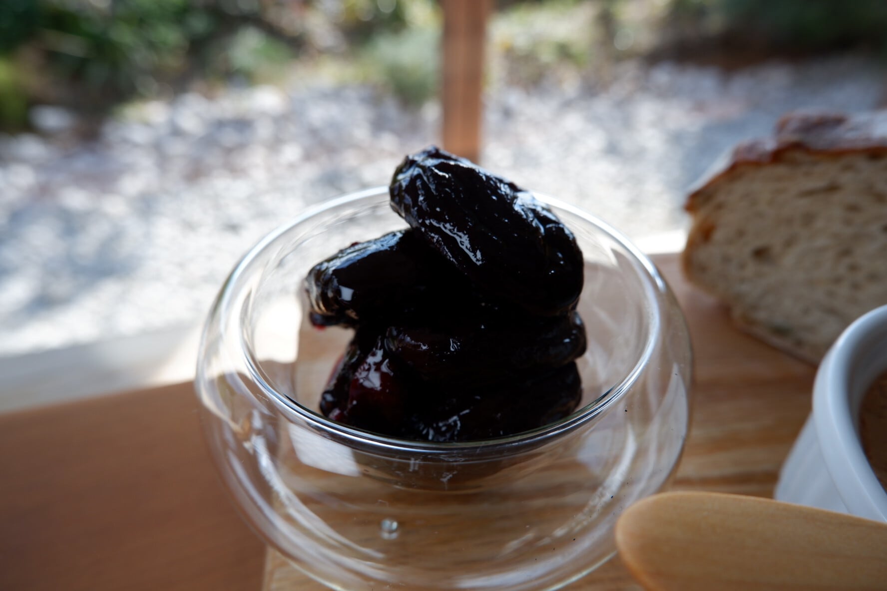 • ドライプルーンの赤ワイン煮: 濃厚な口直しにぴったりの甘酸っぱいプルーン。